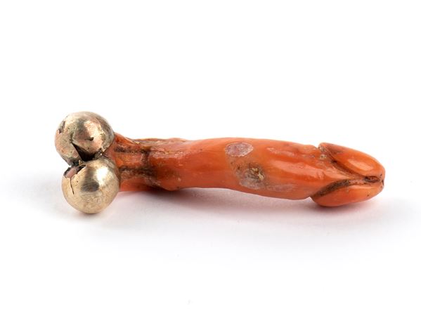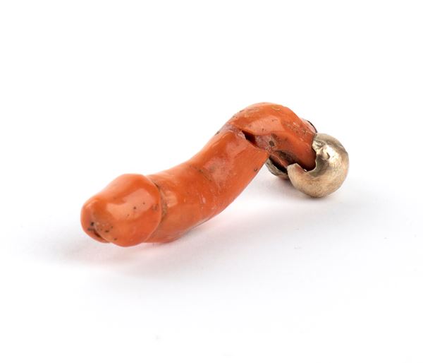 Red Mediterranean coral (Corallum Rubrum) carved in the shape of a phallus, with metal details.