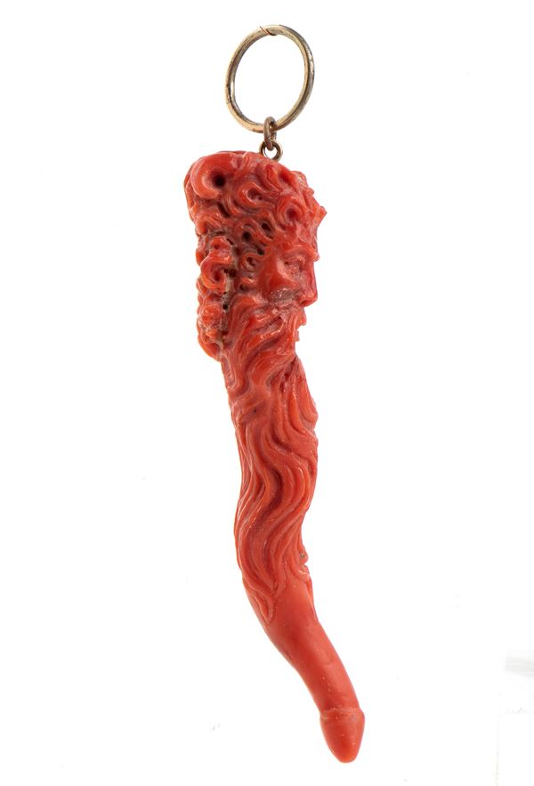 Red Mediterranean coral (Corallum Rubrum), horn-shaped, carved to depict a faun.