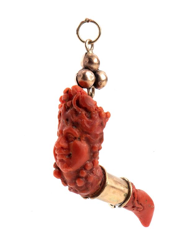 Red Mediterranean coral (Corallum Rubrum), carved in the shape of Bacchus, god of wine, fertility, pleasure, music, theatre and festivals in Greek and Roman mythology. The figure of Bacchus is often depicted with a crown of vines, symbolising abundance and liberation. Coral as a protective talisman combined with the vital energy and abundance represented by Bacchus could symbolise protection that not only keeps evil away, but also promotes prosperity, fertility and joy.