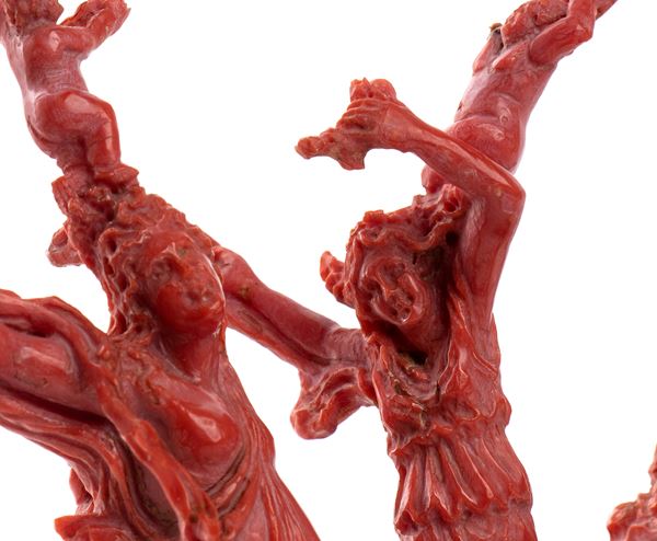 made of red Mediterranean coral (Corallum Rubrum), carved to depict a group of festive nymphs placed on the waves with fish and starfish.