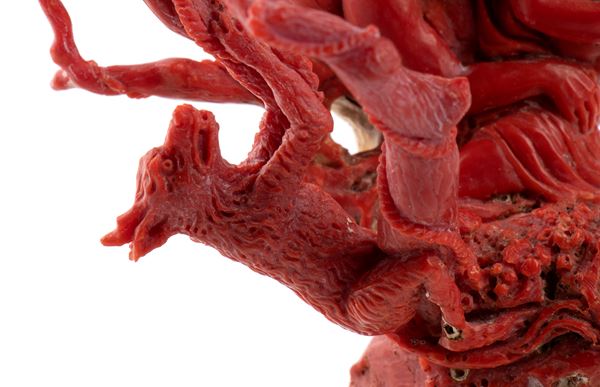 red Mediterranean coral (Corallum Rubrum), sculpted to represent the scene of the Rape of Proserpine, a famous myth from Roman and Greek mythology: Proserpine, daughter of Ceres (Demeter), goddess of the earth and agriculture, while in the fields picking flowers with her friends, is suddenly abducted by the god of the Underworld, Pluto.