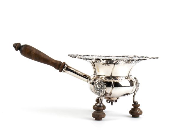 circular in shape, openworked and engraved with floral and vegetal motifs; it rests on three claw feet set on turned round wooden supports, with a copper bottom. Fitted with a turned wooden side handle.