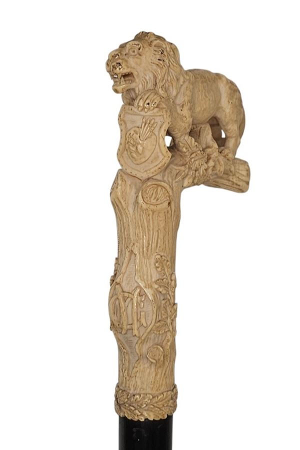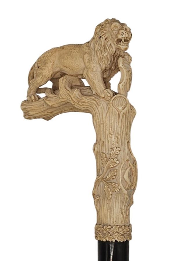 with elephant ivory handle (Elephas maximus Linnaeus, 1758 or Loxodonta africana Blumenbach, 1797) depicting a lion carved in the round in a heraldic position holding a shield.