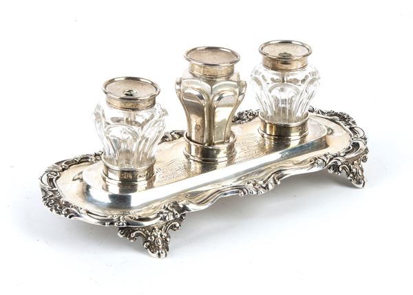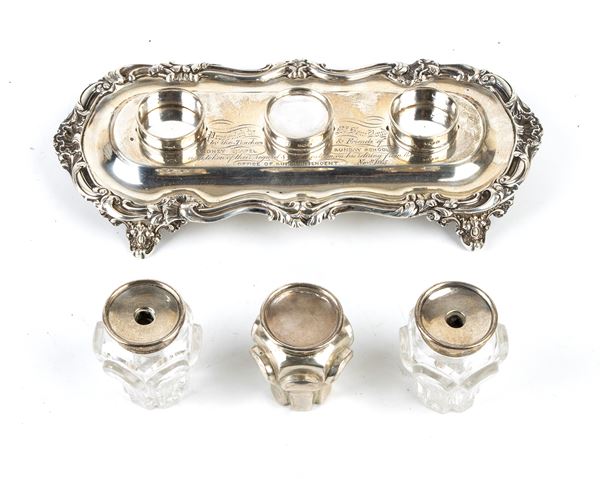 Shaped oval, the rim with floral and foliate ornaments continuing on the four feet; fitted with three cylindrical supports on which a sand container is grafted in the centre flanked by a pair of ground glass ink containers, each with lids. Engraved with dedication dated November 1865.