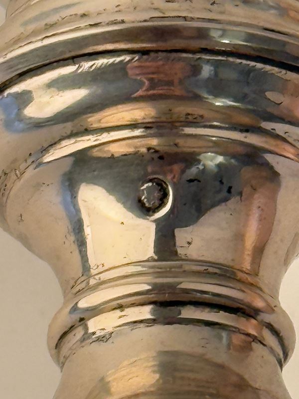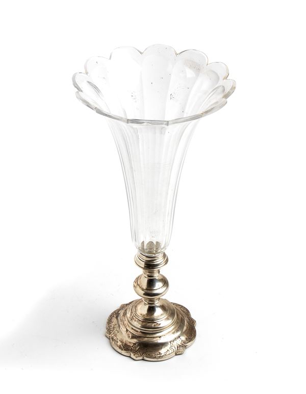 round and shaped base, decorated with leaves stylised motives, smooth body with a round shaped node, and in flower-shaped ground crystal vase.