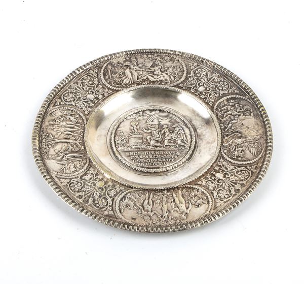 Circular dish, large flap with floral motifs, with four oval reserves containing scenes from the Old Testament depicting Adam and Eve in the Garden of Eden and the expulsion from Paradise. In the centre, as depicted in the German engraving, the figure of Noah who, after touching down with the ark in the background, makes an offering to God, who appears in the clouds crowned.