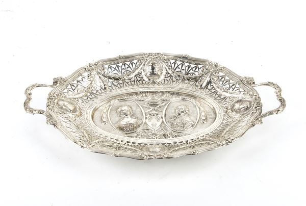 Oval-shaped basket with side handles, entirely openworked and decorated with geometric motifs and festoons linking oval reserves with half-length male figures; in the centre are three-quarter-length figures of Marie-Louise of Austria and Napoleon Bonaparte.