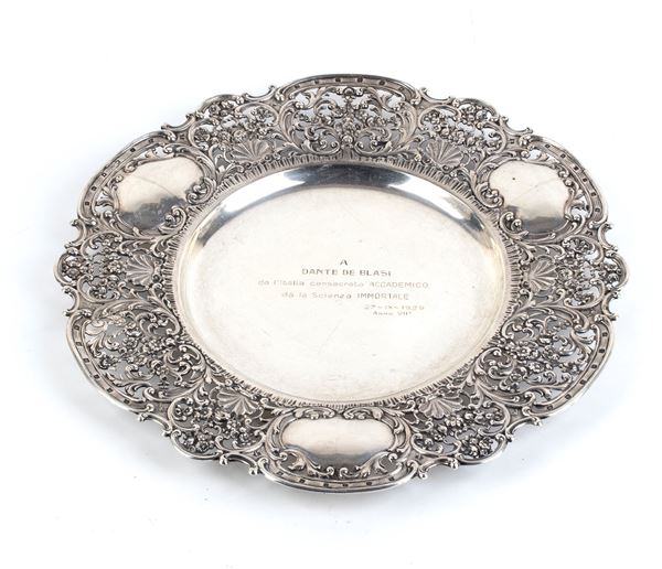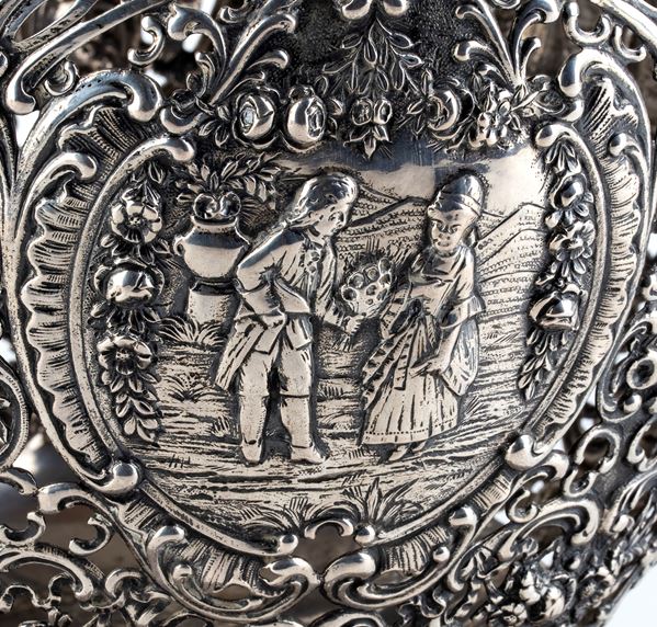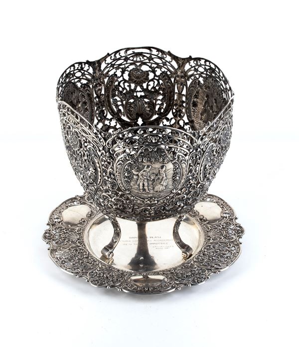 comprising of a round shaped plate, openwork with floreal motives, volutes, and shells, and a vase set on three volute feet, openworked, decorated with floreal and volute motives that frame three chivalrous scenes into a bucolic landscape.