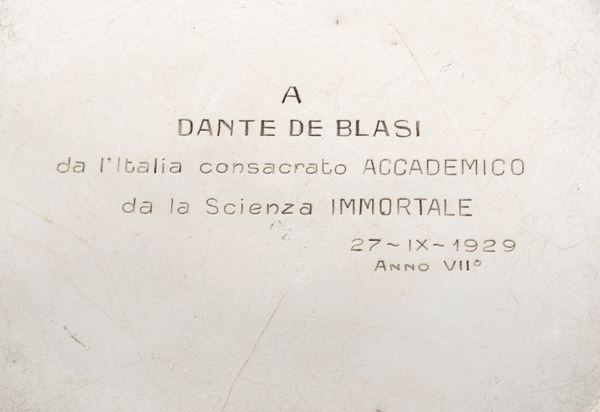 On the plate there is the inscription reading: "A DANTE DE BLASI, DALL'ITALIA CONSACRATO ACCADEMICO DA LA SCIENZA IMMORTALE - 27 - IX - 1929".