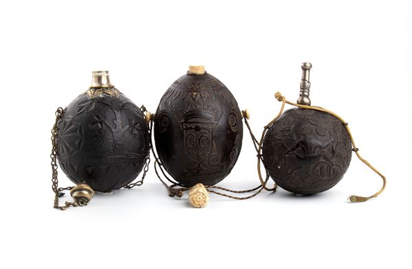 Group of 3 sailor’s carved coconut Bugbear powder flask, Early 19th century