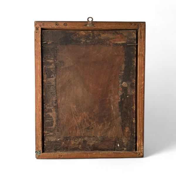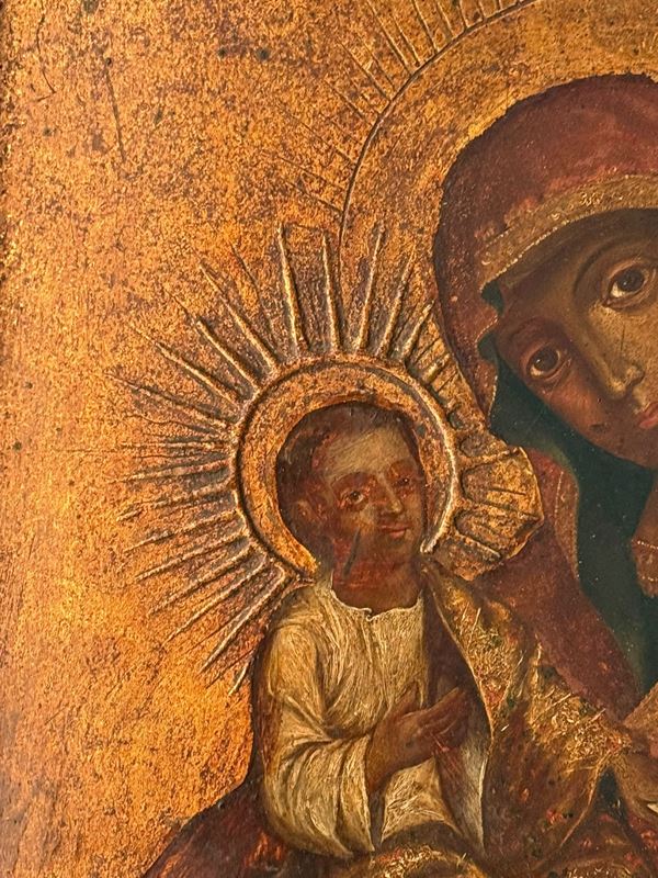 The Virgin retains the solemnity that characterises the canon of the Virgin Odigitria, she is presented frontally with her head gently inclined towards her son, seated on her left arm, her left hand outstretched towards Jesus Christ, whos represented by a child-like figure but with adult features and attitudes, blessing with his right hand and holding a scroll with the divine law in his left hand.