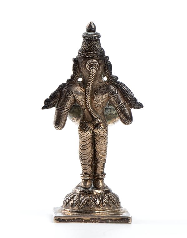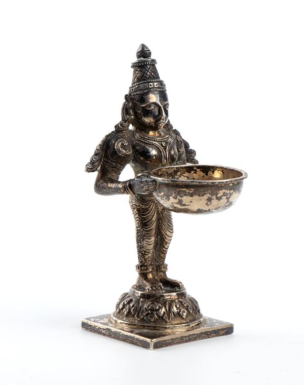 The standing figure holds a bowl. It rests on a square base with a circular decorative motif with leaf motifs.