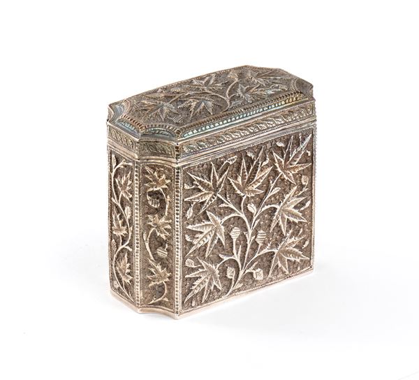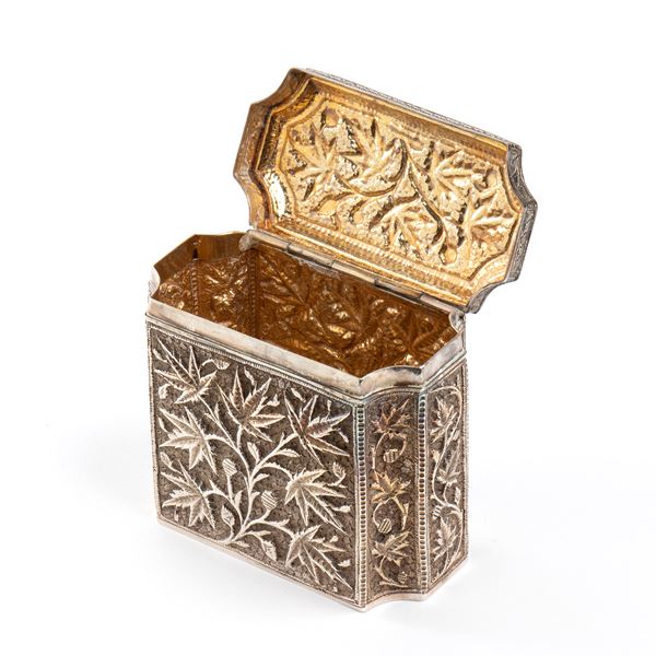 rectangular in shape with convex corners, embossed and chiselled with repeated leaf motifs; hinged lid. Gilt interior.