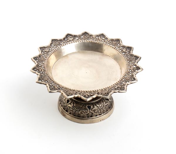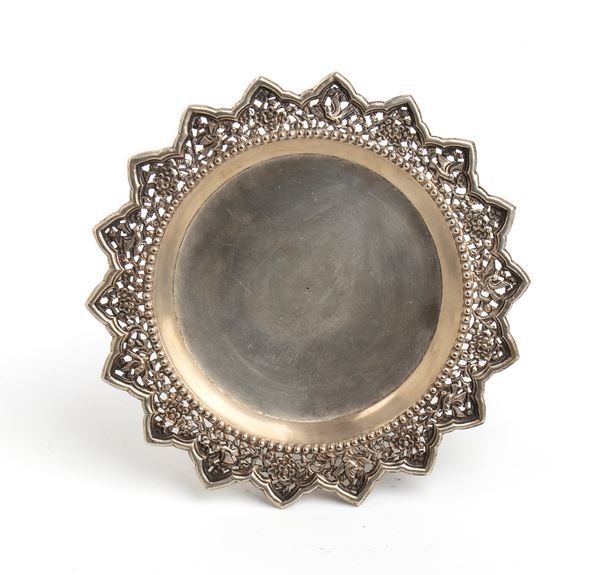 on a circular base, the upper part is shaped and has openwork decoration with plant and floral motifs.