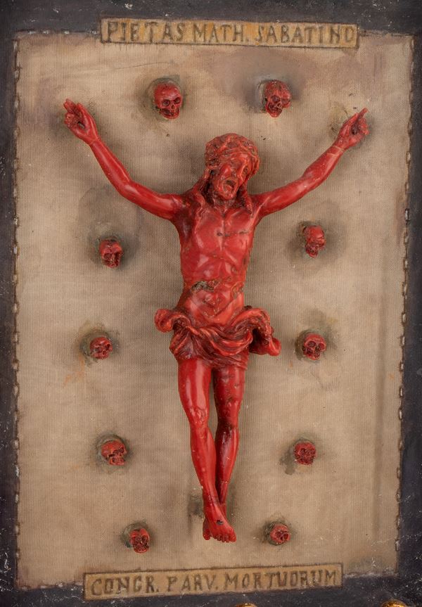 Corpus Christi in Red Mediterranean coral (Corallium rubrum), set in a gilded wooden case with a frame decorated with leaf motifs.