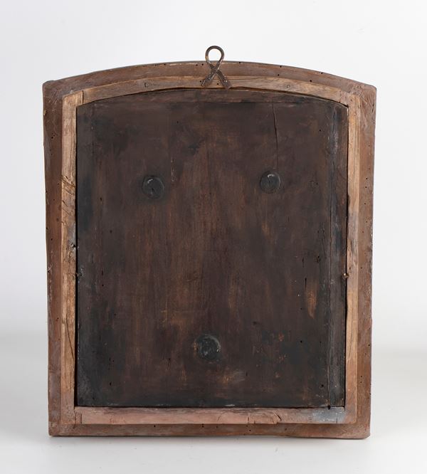 The figure of the Saviour, depicted without a cross on a black and white fabric background, is modelled with anatomical care: the arms are open and semi-outstretched, the hands are half-open with the nails attached directly to the wooden base, given the absence of a cross. The torso presents a well-defined musculature, while the left leg is outstretched and the right leg is bent, with the feet crossed and also nailed to the bottom. The intimate parts are covered by a tight-fitting loincloth, draped horizontally.