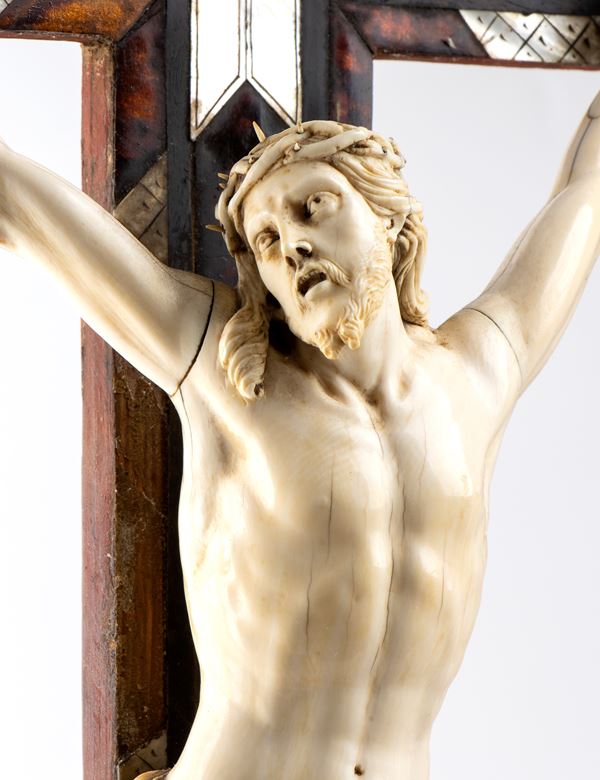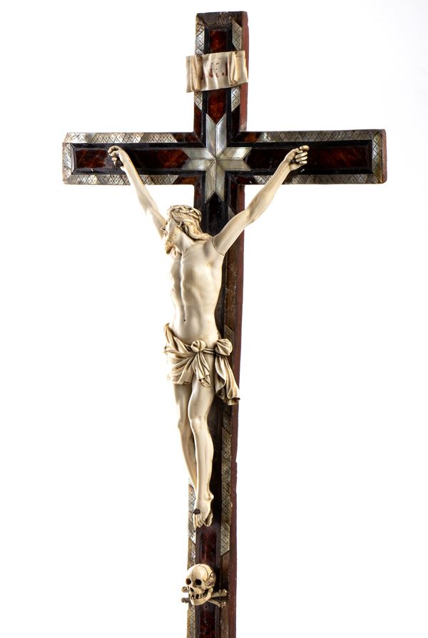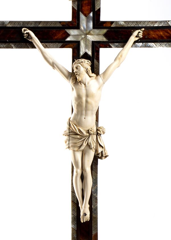 carved elephant ivory Corpus Christi (Elephas maximus Linnaeus, 1758 or Loxodonta africana Blumenbach, 1797), placed on a wooden cross veneered with mother-of-pearl and tortoiseshell (hawksbill sea turtle, Eretmochelys imbricata, Cheloniidae).