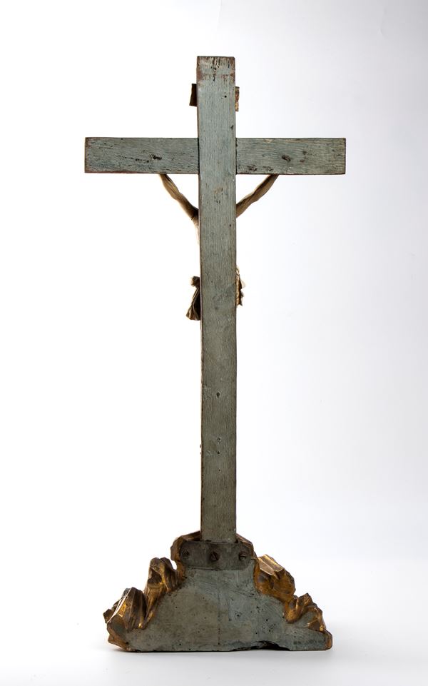 The figure of the Saviour is studied anatomically; the hands are slightly ajar and the nail holes are located closer to the wrist and not in the centre of the hand. The head has the crown of thorns and is folded towards the right shoulder, facing upwards; the soft hair falls to the shoulders, the eyes are open and turned towards heaven and the mouth is half - closed. The legs of the crucifix are positioned parallel, the feet are overlapped and nailed together. The private parts are covered by a loincloth with a side drape.