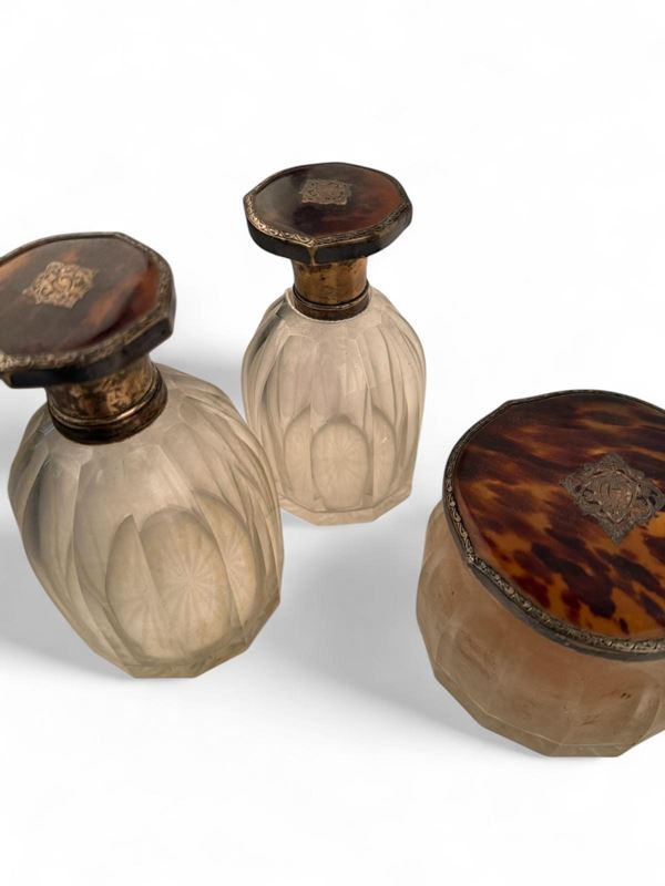 in silver, sea turtle (hawksbill sea turtle, Eretmochelys imbricata, Cheloniidae) and ground glass, composed of three hairbrushes, a comb, a mirror, a shoehorn, two bottles and a powder case.