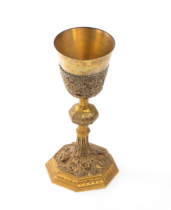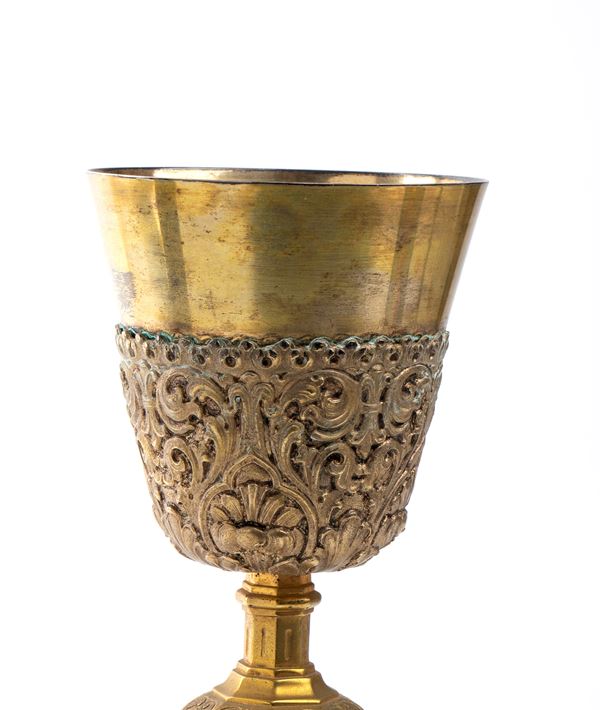 octagonal base decorated with plant motifs and the four symbols of the evangelists, the bull, symbol of the evangelist Luke, the angel, symbol of Matthew, the eagle of St. John and, finally, the lion of St. Mark. Architectural shaft with geometric knot decorated with engraved shells; smooth cup decorated with plant motifs at the bottom.