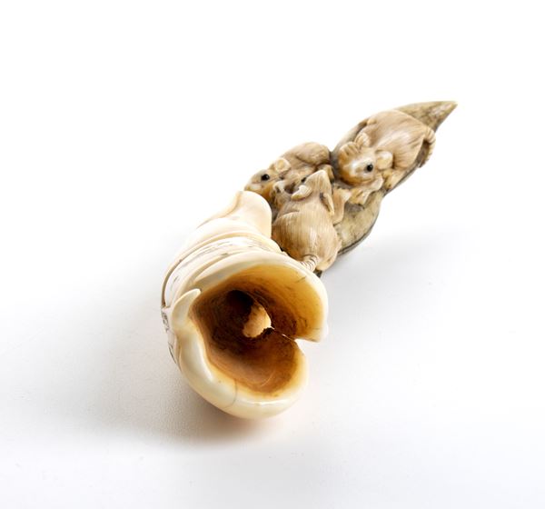 carved marine ivory (Physeter Linnaeus, 1758 or Orcinus orca, Linnaeus, 1758) depicting a myriad of mice climbing a pea plant.