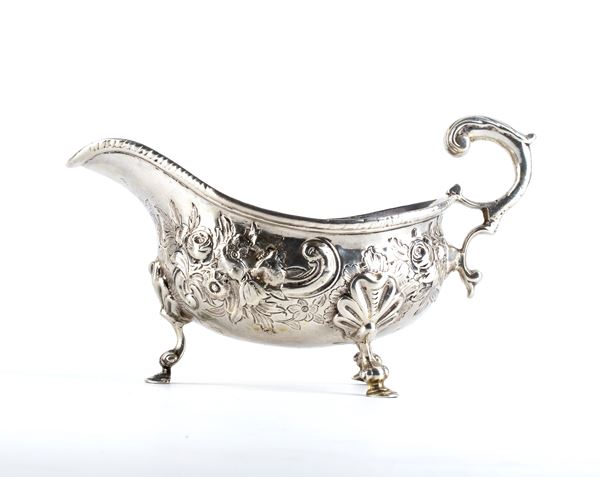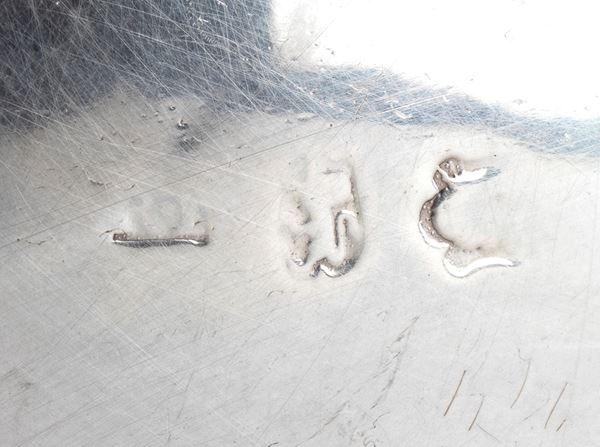 Sterling silver, hallmarked with faintly legible marks used in London between 1740 and 1755, and bearing the mark of a silversmith likely identifiable as Richard Kersill (entered in 1744).