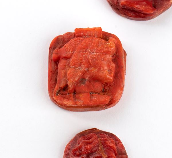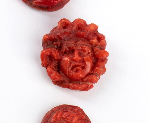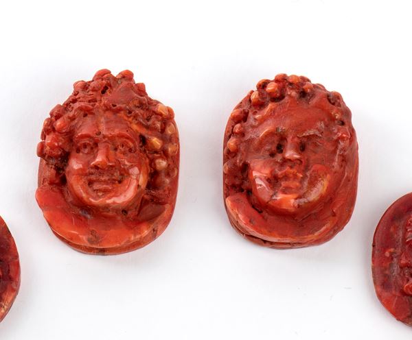 in red Mediterranean coral (Corallum Rubrum), carved to depict different faces: two male faces with curly hair; a face of a jellyfish; two female faces with gathered hair caught in profile; two three-quarter-length female figures with gathered hair; two figures with their heads covered by a veil; two female figures with their hair loose; a cameo of rectangular shape with rounded corners with the profile of an Egyptian figure.