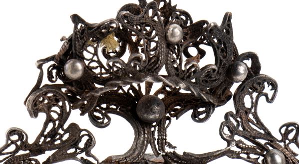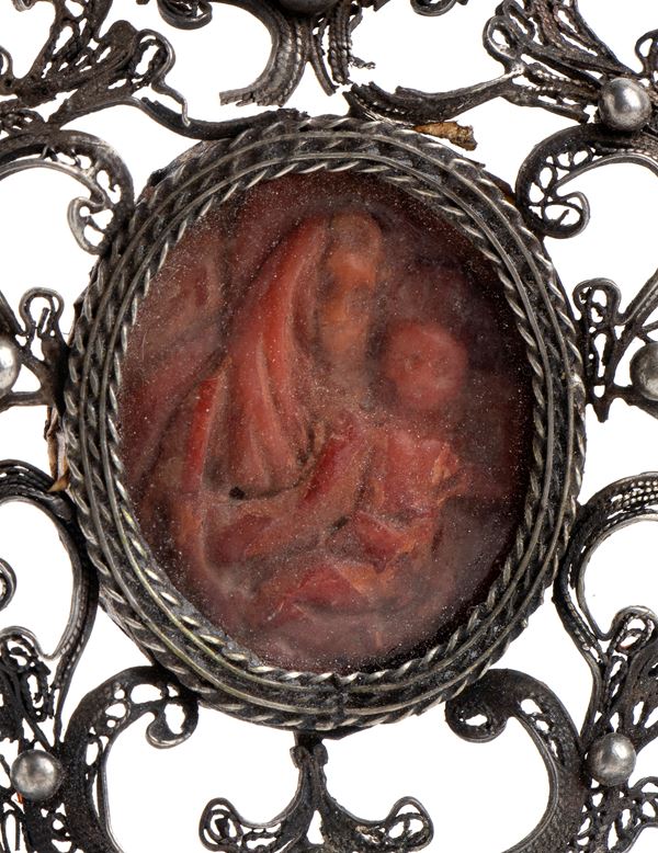 red Mediterranean coral (Corallum Rubrum), sculpted to depict the Madonna and Child, set in a filigree silver frame with floral motives.