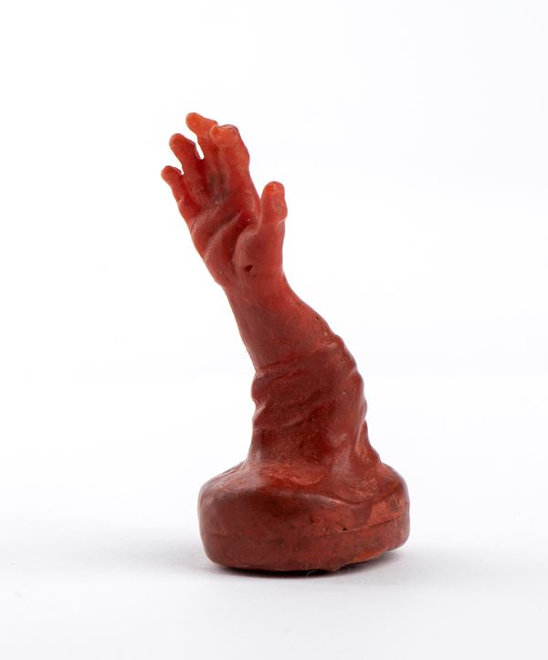 Red Mediterranean coral (Corallum Rubrum), carved to represent a hand; underneath, the symbol of the square and compasses, one of the most recognisable and important emblems of Masonry.