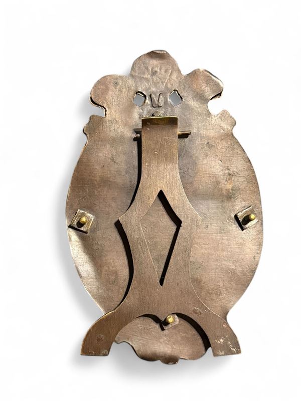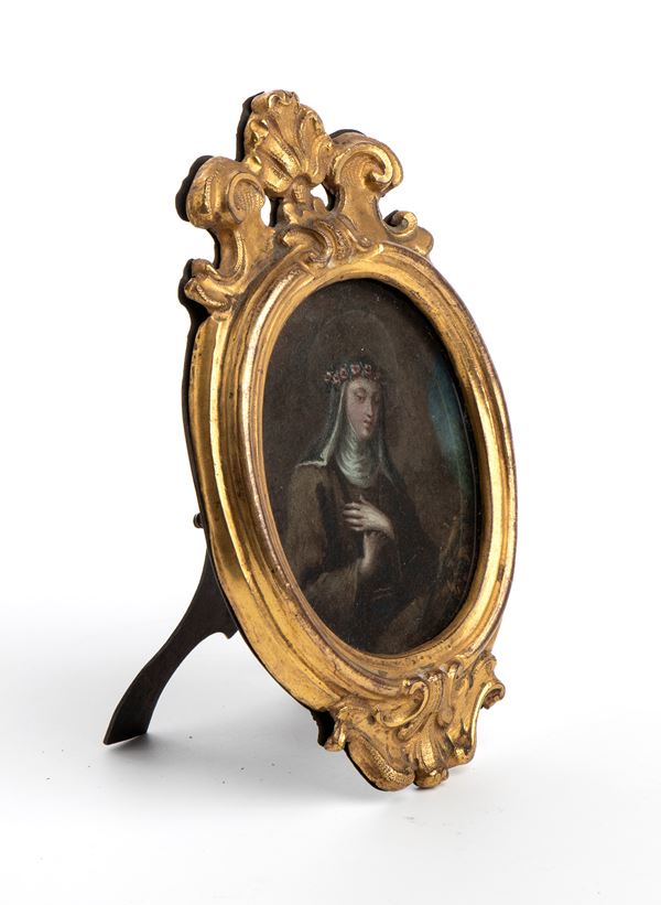 Saint Rita is depicted in the centre, her hands resting on her chest as a sign of devotion and her head slightly bent forward, adorned with a nimbus with a wreath of flowers. The figure of the Saint is set in a naturalistic landscape context.