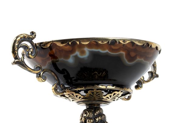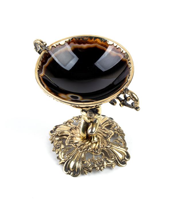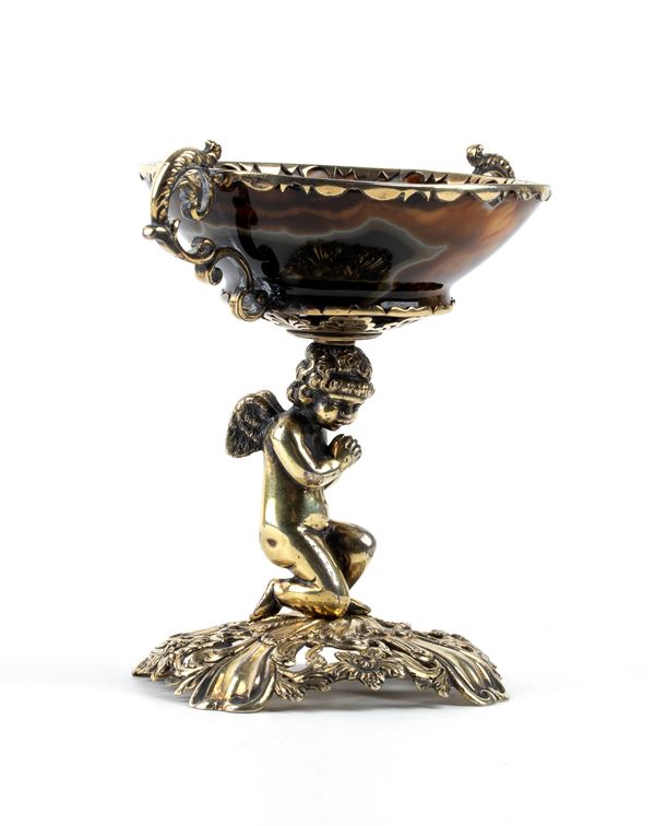 Flared agate cup with a gilt silver mount featuring side handles adorned with vegetal motifs, resting on a stem in the form of a kneeling putto with folded hands in prayer. The circular base is decorated with floral motifs.