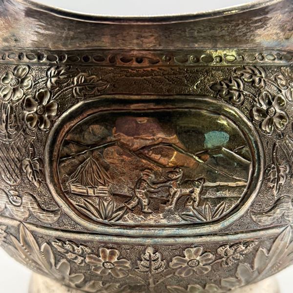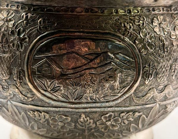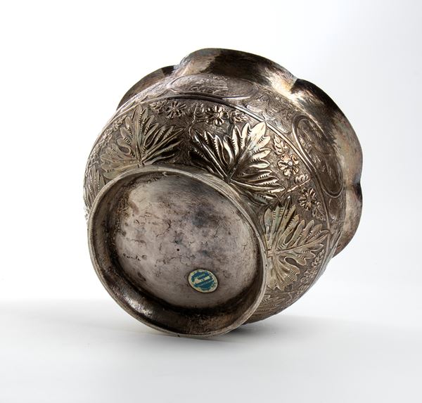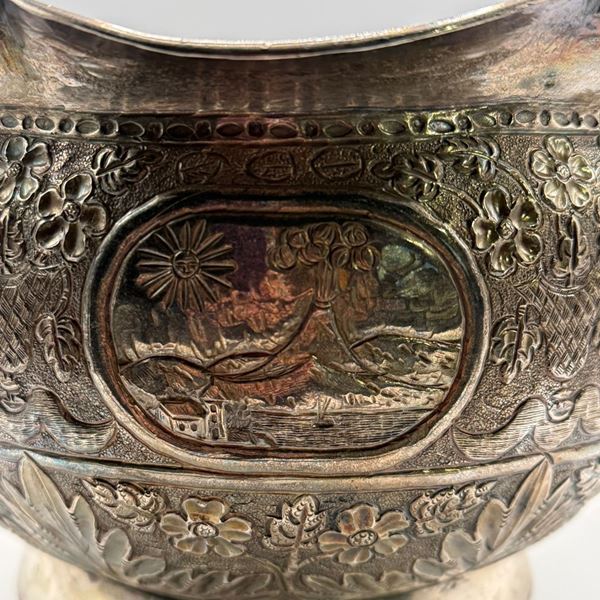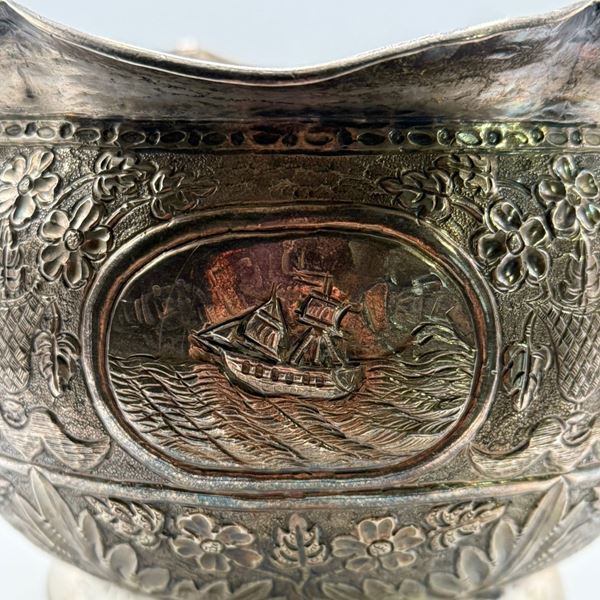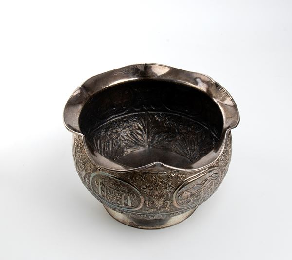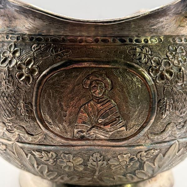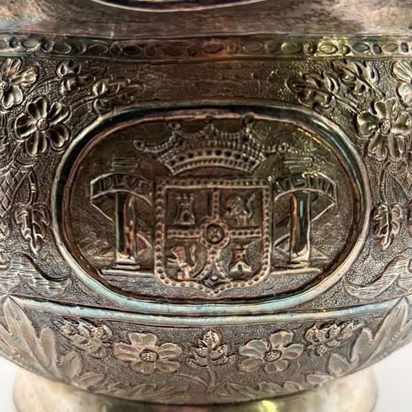 circular shaped with moulded rim, resting on an annular foot, richly embossed and chiseled from a sheet with vegetal and floral motives; on the body, within oval reserves, the coat of arms of the Kingdom of Spain "Flag of the maritime plazas, castles, and forts defending the coasts of Spanish territories between 1701 and 1771 and in 1793", and scenes depicting the eruption of the Santa Catalina volcano in Lanzarote in 1730.