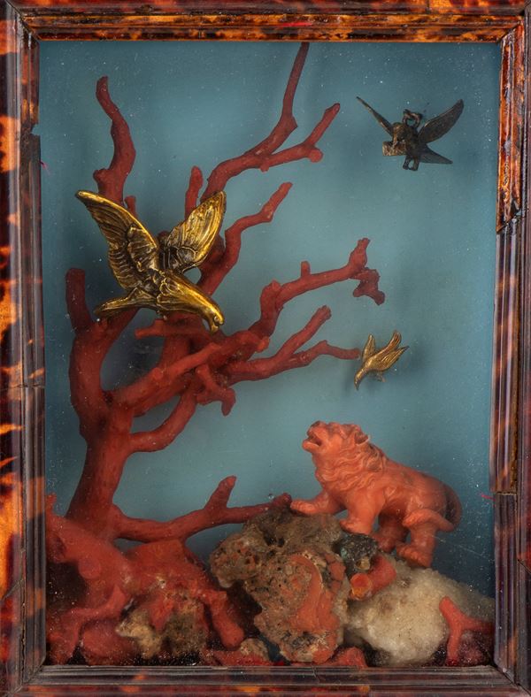 Inside the case, the glass protects a delicate three-dimensional landscape made primarily of coral and metal. The Mediterranean coral (Corallium rubrum) is arranged to form a tree with intricate branches; among the branches and across the scene, one can spot other decorative details in gilded metal, including small animals or birds. At the center of the landscape stands an animal figure – a lion - carved from Cerasuolo coral (Corallum Eliatus); positioned on a base evoking natural rock, it faces one of the bird figures, likely a hawk, crafted in gilded metal. Two more birds—one in gilded metal and the other in silvered metal—are placed in the background on the right, one at the top and the other in the center.