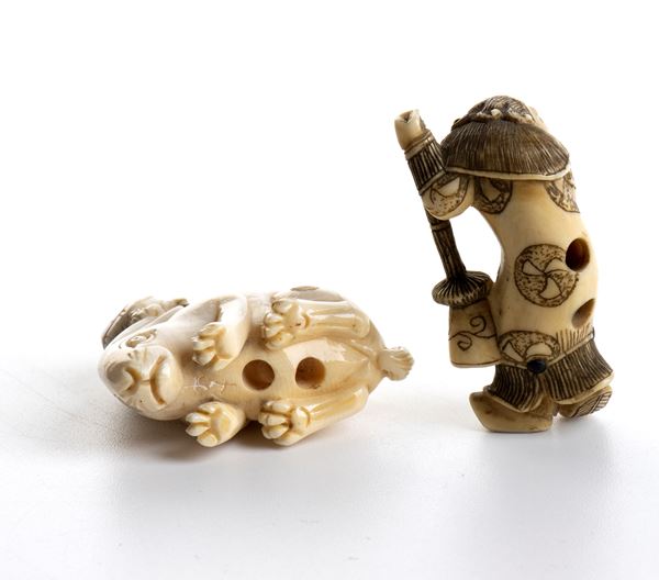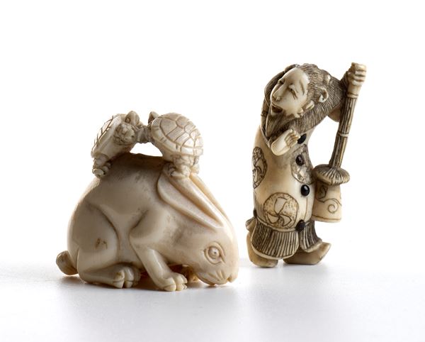 carved marine ivory (Physeter Linnaeus, 1758 or Orcinus orca, Linnaeus, 1758) depicting two turtles on top of a rabbit and a male figure.