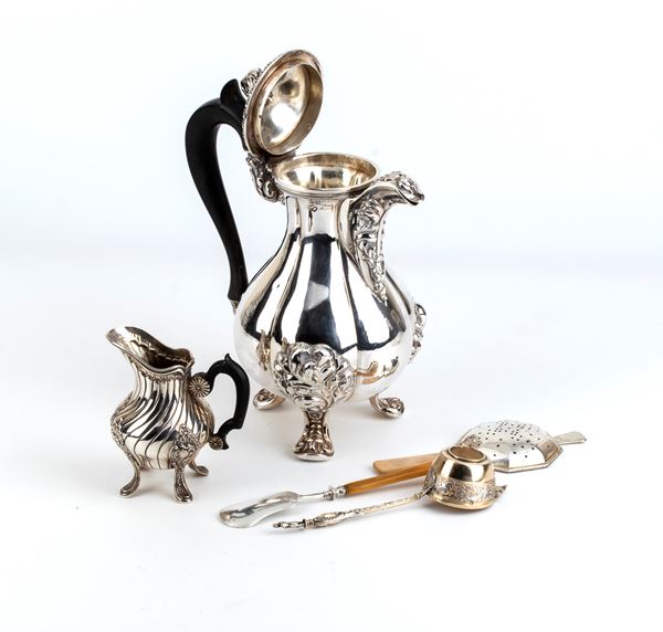 2) Milk jug: 950/1000 silver, hallmarked with the French silver hallmarks in use in Paris from 1838 to 1973, silversmith Ernie, Edward, hallmark identified in 1882; size: 10.5 x 7.5 x 9 cm;