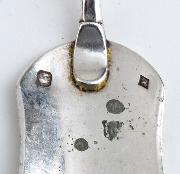 5) Spoon: 950/1000 silver, hallmarked with the French silver hallmarks in use in Paris from 1838 to 1973, silversmithh Berthier Philippe, mark identified in 1841; size: 16 x 3 cm.