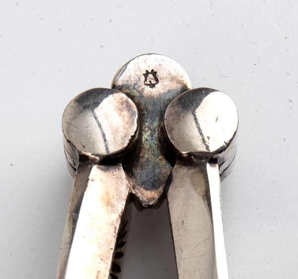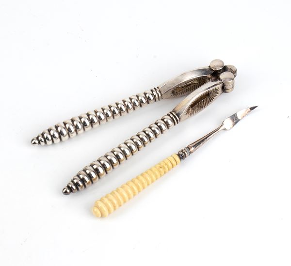 set for nuts composed of two nutcrackers and two tools made of silver plated and turned elephant ivory (Elephas maximus Linnaeus, 1758 or Loxodonta africana Blumenbach, 1797) contained in original leather case.
