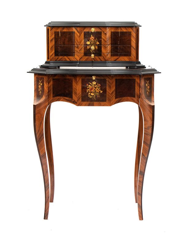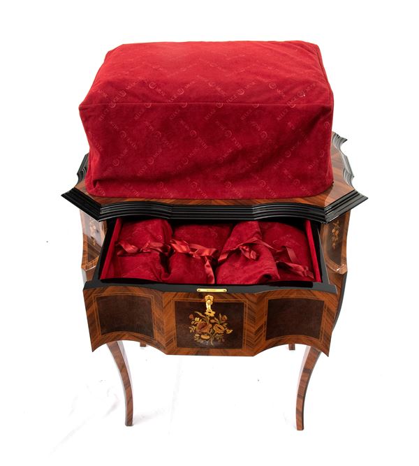 double body, shaped in walnut burl and inlaid in fruit woods forming floral decorations, consisting of an upper structure containing the musical cylinder mechanism and an inferior part formed by drawers containing interchangeable musical cylinders. Gilt handles and locks.