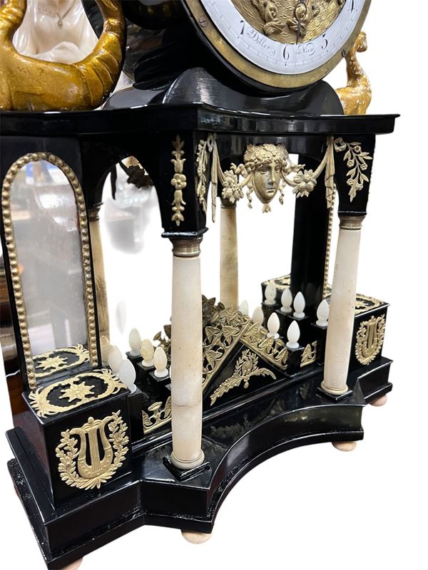 spring movement, Viennese 4/4-hour chime on chime coils, ‘blacksmith and grinder’ mobile dial automaton, chime off switch, repeater function, enamelled dial ring, polychrome wood architectural case, three mirror panels, alabaster columns and feet, carved finials painted in gold, lambrequins, brass figurative appliqués.