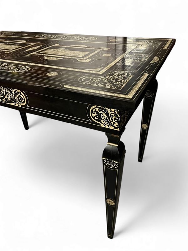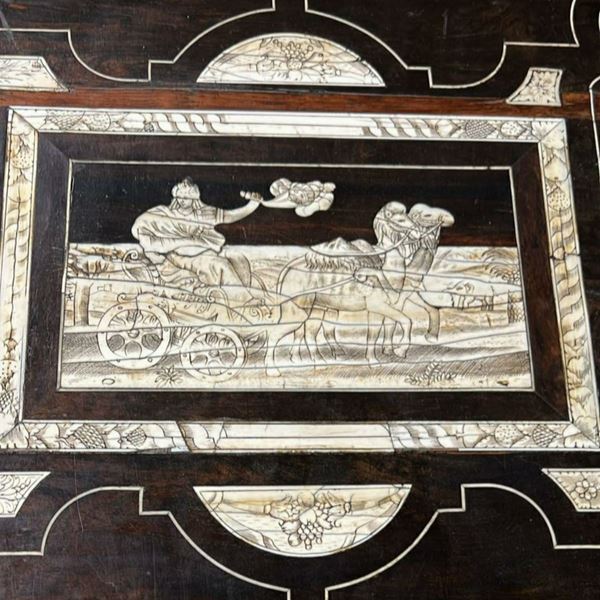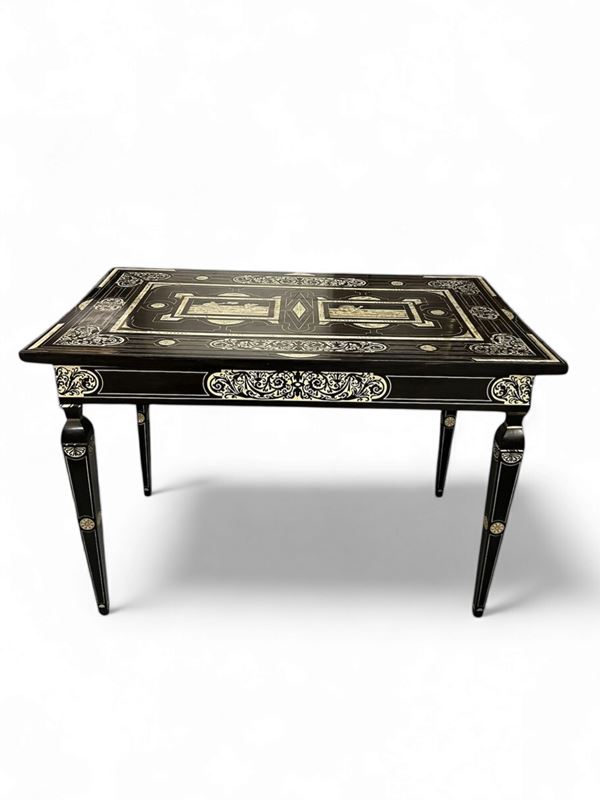 The exquisitely crafted table belongs to the typology of works from the workshop of the Milanese ebonist Ferdinando Pogliani (Milan 1832 - 1899). Active for the rich Milanese bourgeoisie, he had a workshop first in Porta Vittoria and later in Montenapoleone. The artist distinguished himself for the exceptional quality of his ivory inlays and the complexity of his figurative decorations, inspired by Neo-Renaissance taste.