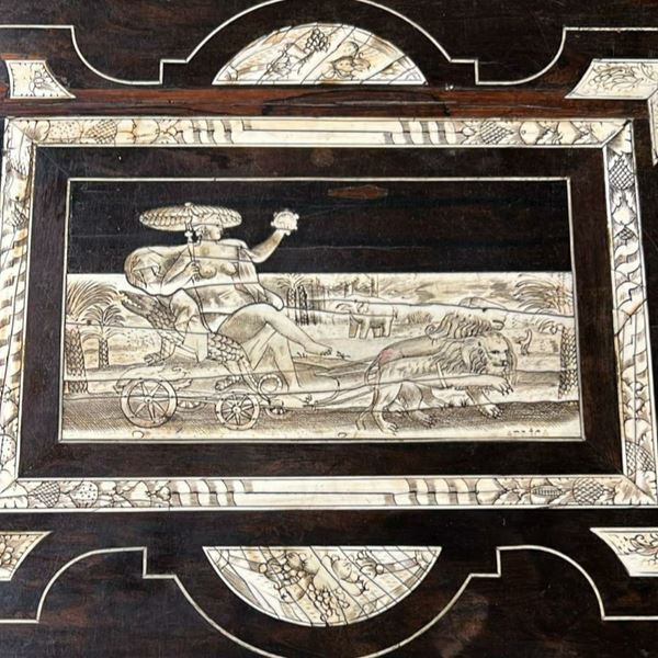 The rectangular table, resting on truncated pyramid-shaped legs, features a richly decorative pattern on its upper surface with intricate details framing two figurative scenes. In the first scene, a half-naked woman is depicted on a small chariot drawn by lions, accompanied by a crocodile, an exotic and mythological symbol. In the second scene, a man is shown on a chariot drawn by dromedaries, evoking an oriental-inspired imagery.