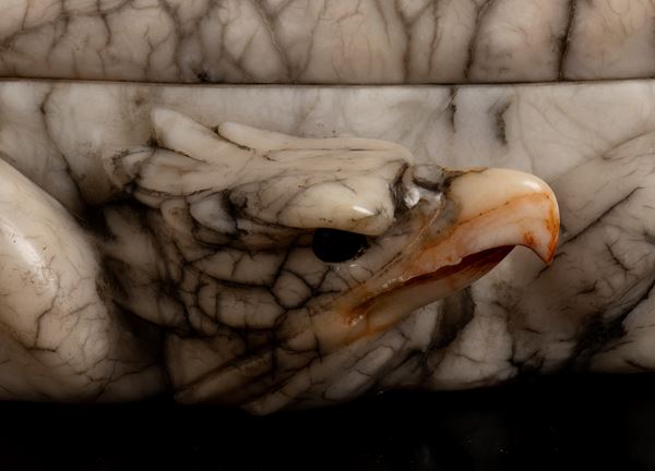 Placed on a stepped oval base carved on the front with the head of an eagle with spread wings.