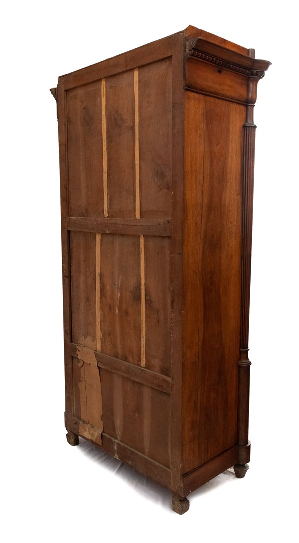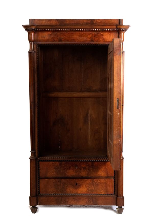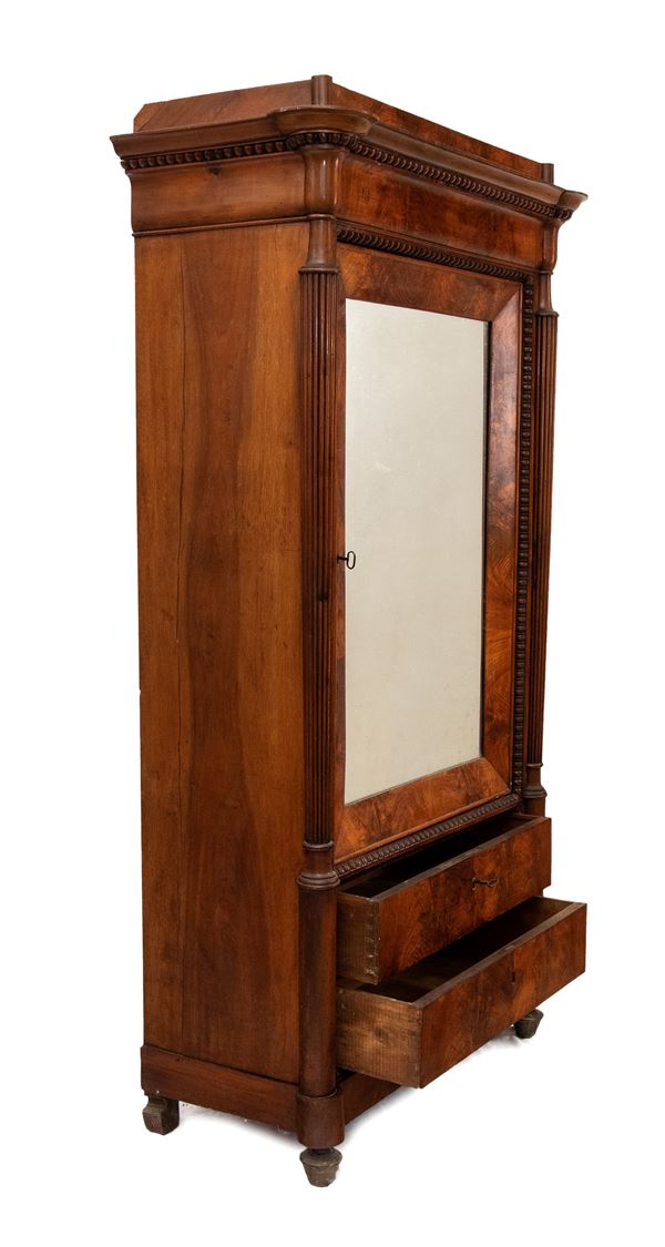 walnut and featherwood with central mirror and two drawers; fluted columns set on sides.
