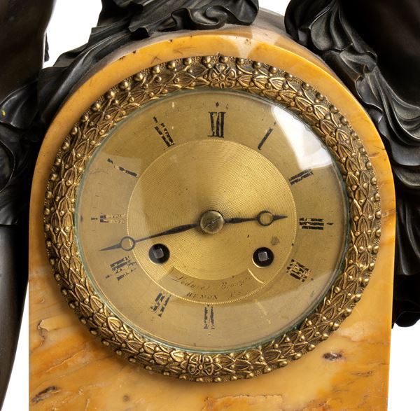case with a yellow Siena marble and gilded bronze base, surmounted by the figure Psyche in the act of crowning Cupid in patinated bronze, iconography taken from the model by Claude Michallon (1751-1799); circular dial with Roman numerals signed "Ledure Bronzier Hémon", movement with wire suspension, pendulum regulator and bell striking the hours and half-hours.