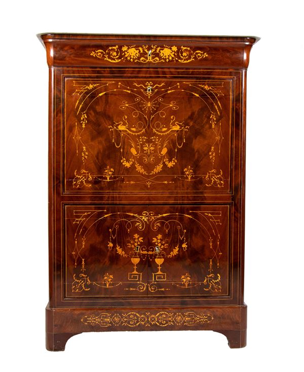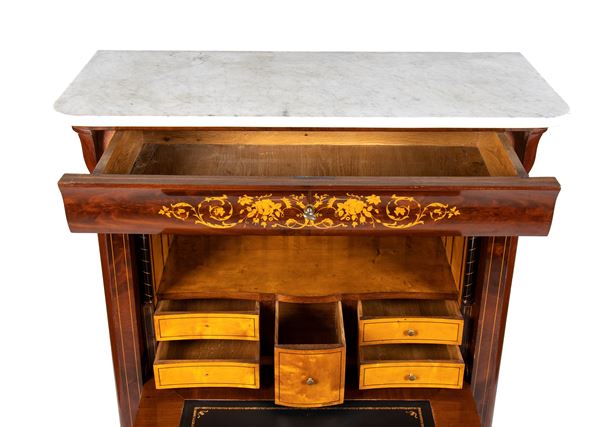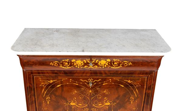 mahogany wood inlaid with boxwood attributed to Louis Edouard Lemachard (1795-1872), white marble top with inlaid under-top drawer; maple interior inlaid with amaranth. Two-door lower section.