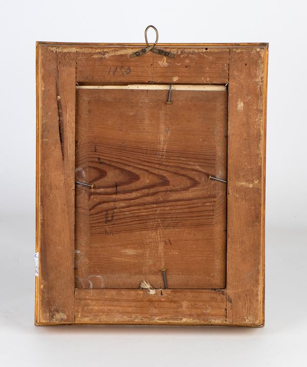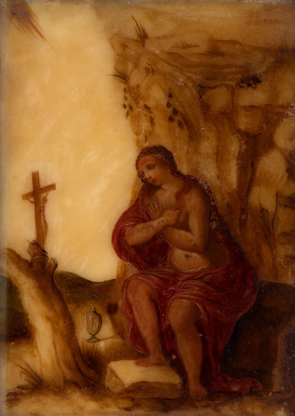 painting depicting the figure of the penitent Magdalene in the desert who, dressed in a red cloth, contemplates the crucifixion. Set in a gilded wooden frame.