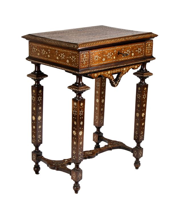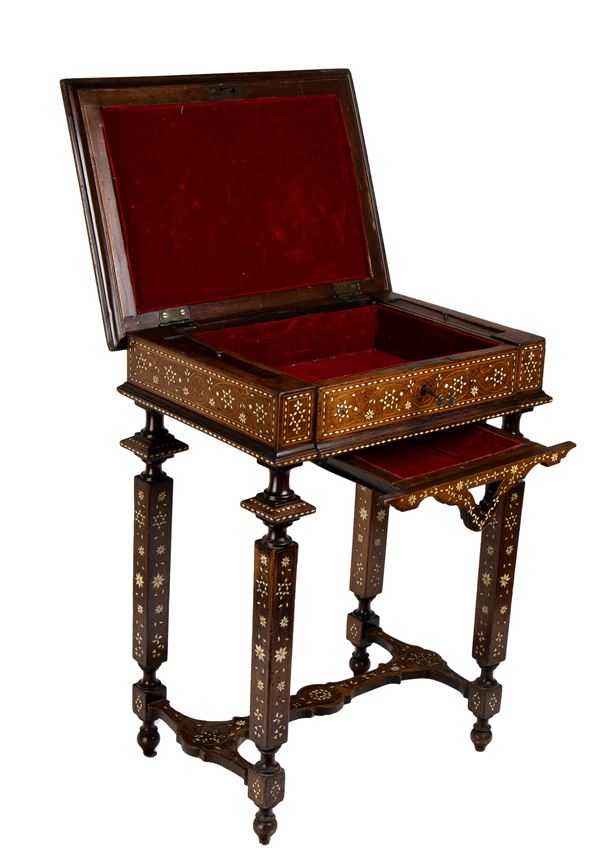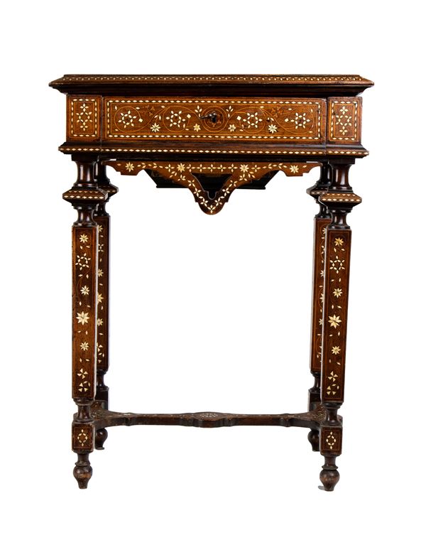completely inlaid in bone and fruit wood with floral and geometric motifs. Opening top and front drawer.