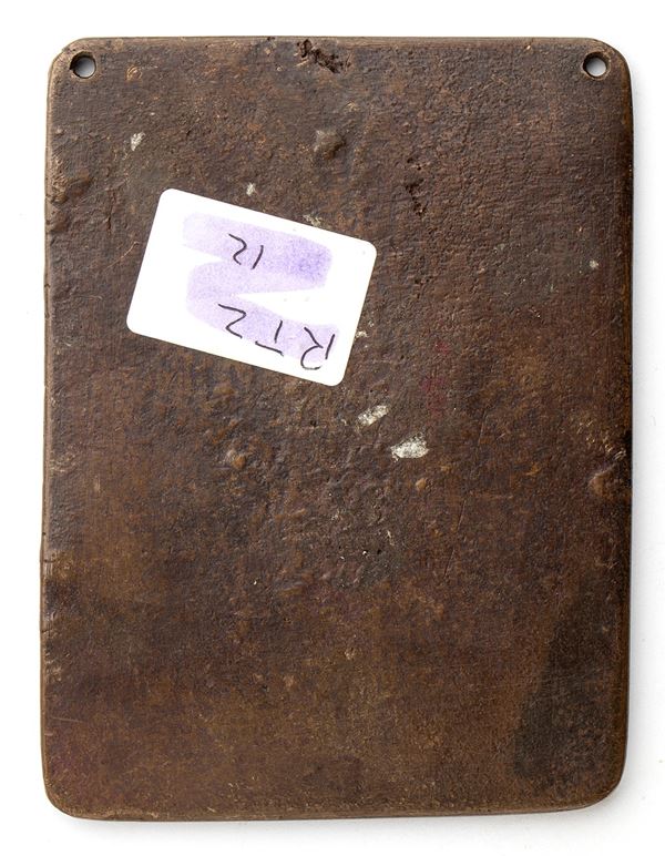 Rectangular bronze plaque with brown patina, two holes at the top; 94.5 x 71.3 mm; 190.6 g.
