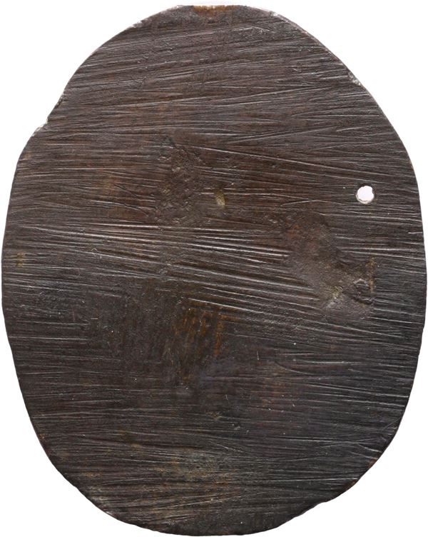 Oval bronze plaque; 53.5 mm; 66 gr. Hole on the right.