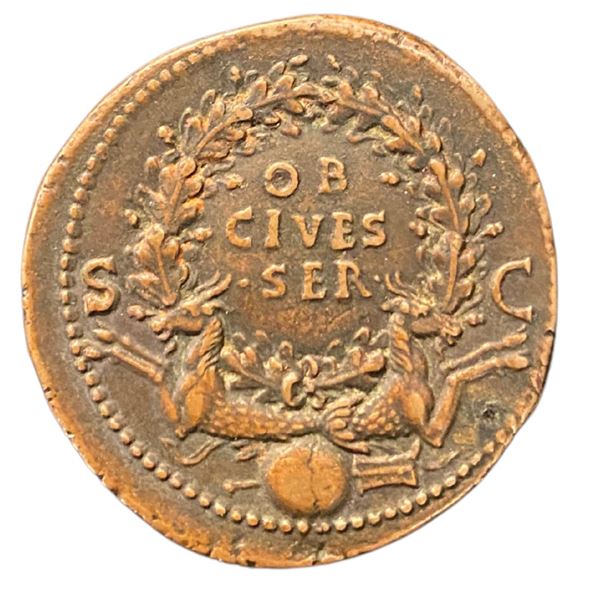 R/ OB/CIVES/SER B (in tre righe) in corona di quercia sostenuta da due capricorni; sotto, globo e remo.